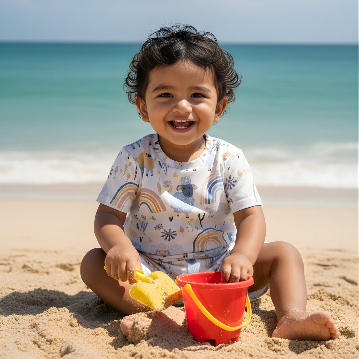 Featuring a fun sunshine graphic print, vibrant color, and a soft-touch finish, it’s a wardrobe essential for every little trendsetter. The half sleeves and regular fit make it ideal for all seasons, while the tag-free neck design ensures itch-free comfort. Due to Lighting & Photography effects, the actual product may slightly different.