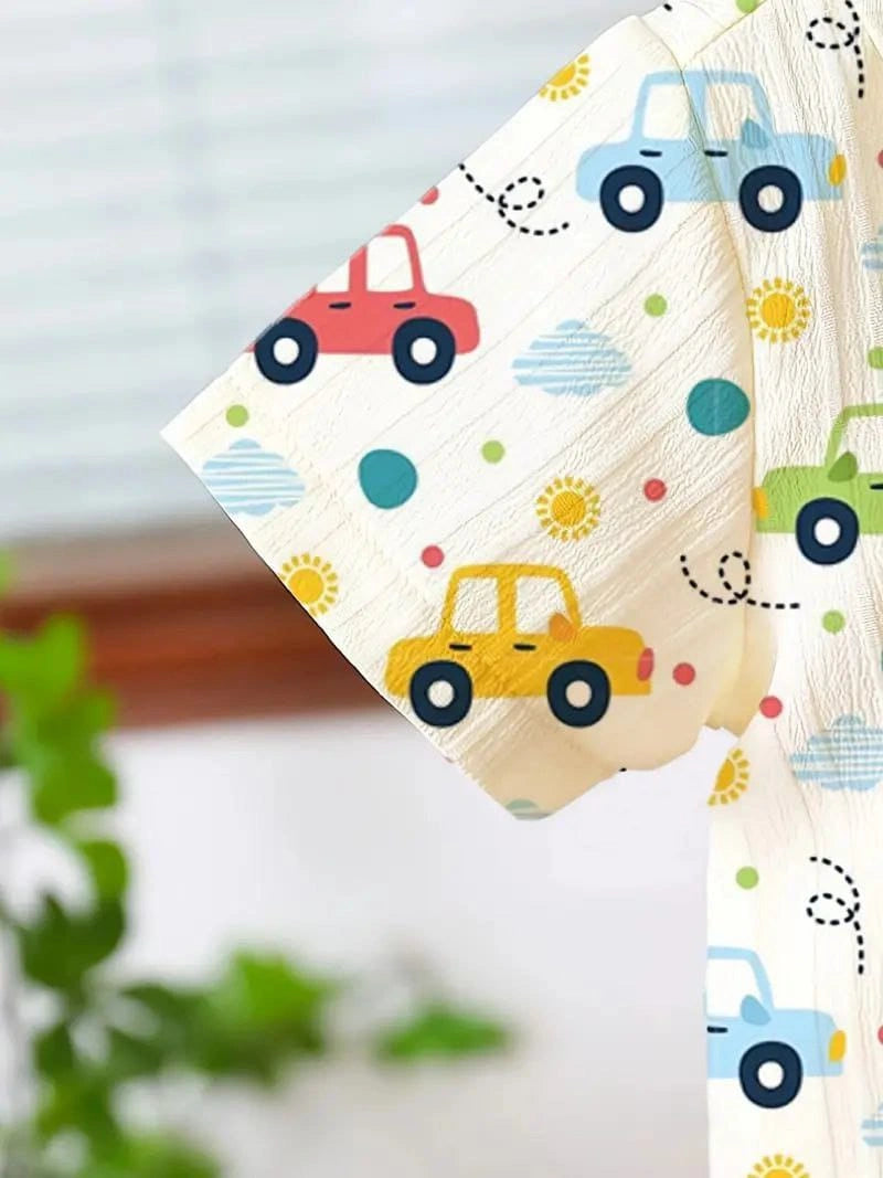 Fuel your little one’s fun with this vibrant and playful car print co-ord set. Crafted from premium soft cotton, this set includes a half-sleeve button-down shirt and matching shorts with a fun multicolored car pattern, suns, clouds, and polka dots. Designed for comfort and style, it’s the perfect outfit for boys and girls aged 1 to 7 years for summer days, playdates, or daily wear.